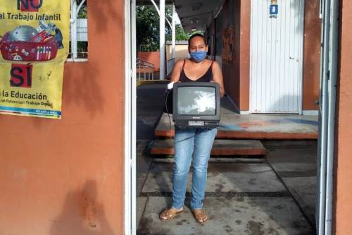 La docente dio a conocer que ya han sido entregadas tres televisiones y este miércoles harán lo propio con otras tres que fueron donadas por la población, “las entregamos personalmente a las familias y niños, comprometiendo a papás que aprovechen el Aprende en Casa”.