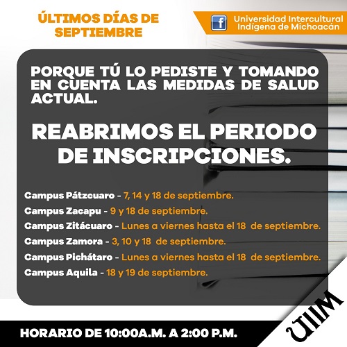Aquila, Mich. La Universidad Intercultural Indígena de Michoacán, en su Unidad Académica Costa Nahua, por medio de un comunicado invita a estudiar la Licenciatura en Turismo Alternativo, e informa que los interesados pueden acudir a inscribirse y pedir más informes los días viernes 18 y sábado 19 del presente mes, en un horario de 10:00 a 14:00 horas en sus instalaciones ubicadas en el Faro de Bucerías, localidad de la Comunidad Indígena de Coire.