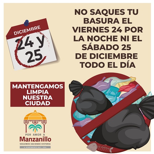 Por ser días inhábiles, el ayuntamiento de Manzanillo anunció que la recolección de basura será suspendida, por lo que se pide a la población en general evite sacar sus residuos a la calle para no provocar un desorden, por costumbre el servicio solo de prestará en la zona turística.