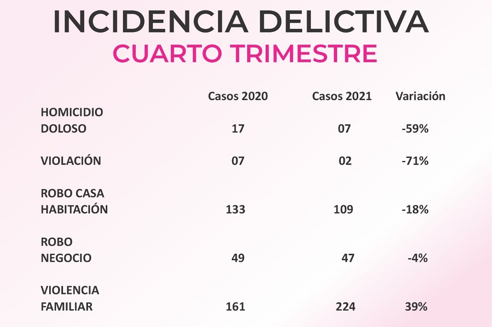 Entre los delitos que registran un incremento en la incidencia en el último trimestre de 2021, destaca el de violencia familiar, que pasó de 161 denuncias en ese periodo del año 2020 a 224 en el acumulado de octubre, noviembre y diciembre del año recién concluido.