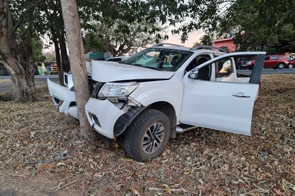 Una camioneta Nissan Frontier blanca quedó impactada en un árbol, a pocos metros de la gasolinera de la localidad de El Trapiche, tras persecución policial, en donde refieren se dio intercambio de disparos de arma de fuego.
