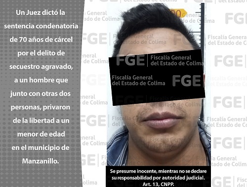 Un Juez dictó la sentencia condenatoria de 70 años de cárcel por el delito de secuestro agravado, a un hombre que junto con otras dos personas, privaron de la libertad a un menor de edad en el municipio de Manzanillo.