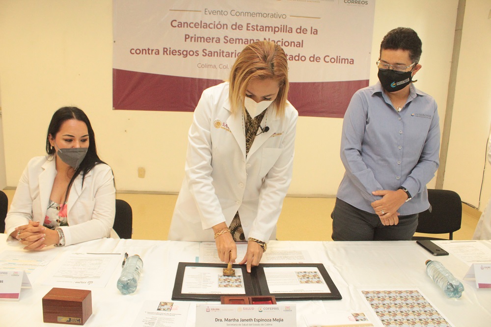 La Secretaría de Salud del Gobierno del Estado de Colima llevó a cabo la réplica de la cancelación de la estampilla postal conmemorativa de la Primera Semana Nacional contra Riesgos Sanitarios, que se realizó del 30 de abril al 6 de mayo de este año en la entidad, a fin de fomentar las buenas prácticas sanitarias en las comunidades.