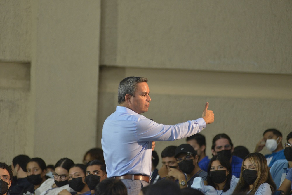 Ante un Paraninfo con más de 700 estudiantes, este viernes el rector Christian Jorge Torres Ortiz Zermeño impartió la conferencia inaugural de la Escuela de Cuadros FEC 2022: “Competencias transversales para los estudiantes de la Universidad de Colima”, en la que compartió con alumnos y alumnas de preparatoria y licenciatura diez características o competencias que les pueden ser de gran ayuda en su vida, sobre todo para ejercer el liderazgo con responsabilidad y sin sufrir afectaciones emocionales o de salud.