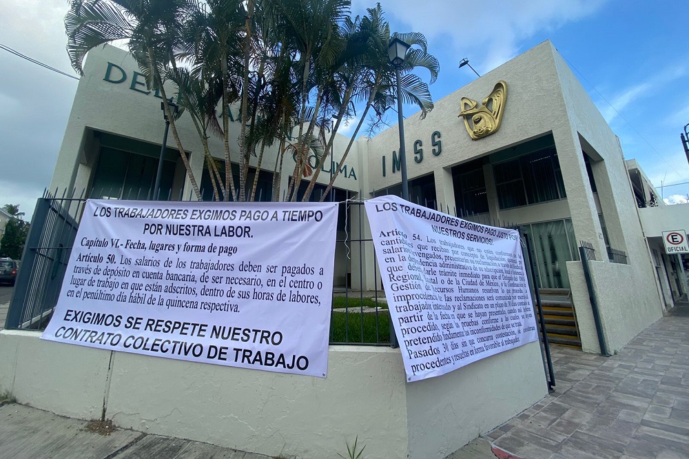 Trabajadores integrantes de la sección XXV del Sindicato Nacional de Trabajadores del Seguro Social (SNTSS) colocaron diversas lonas en el Delegación del Instituto Mexicano del Seguro Social (IMSS) en Colima, en donde denuncian la falta de diversos pagos y prestaciones, así mismo exigen la renuncia del jefe de personal y del encargado de las subcomisiones mixtas.