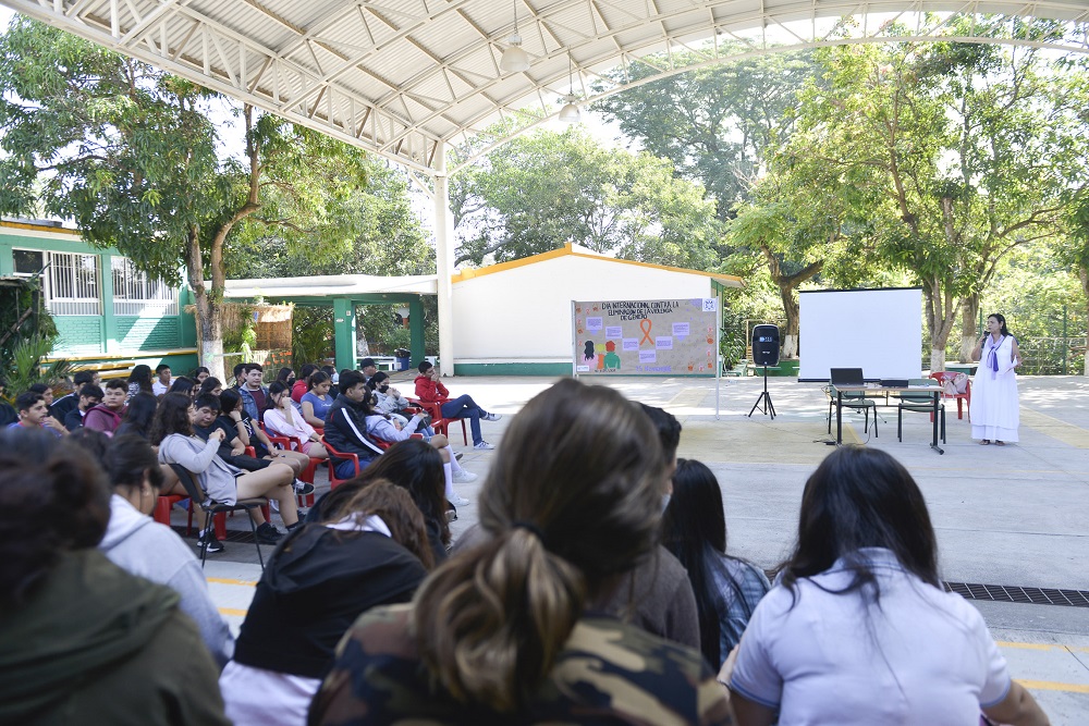Así, entregaron trípticos informativos, colocaron distintivos color naranja y montaron una exposición con dibujos ilustrativos de esta violencia. De igual modo, Jonás Larios Deniz, de la Facultad de Pedagogía, dictó la conferencia: “Las mujeres trans: Rutas de la discriminación y violencia”, en la explanada del Bachillerato 32.