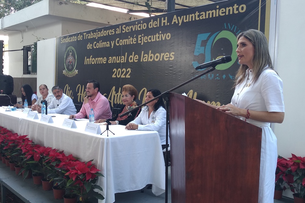 En su mensaje emitido en el marco del informe de labores de Arturo León Alam, secretario general del Sindicato de Trabajadores al Servicio del Ayuntamiento de Colima, la alcaldesa informó a los trabajadores que “el día 14 de diciembre ustedes (trabajadores y trabajadoras) recibirán el bono navideño y prima vacacional, el 15 de diciembre recibirán su quincena y el 16 de diciembre recibirán el aguinaldo, con esto estamos cumpliendo y estamos demostrando, una vez más, que estamos del lado las y los trabajadores del ayuntamiento de Colima”.