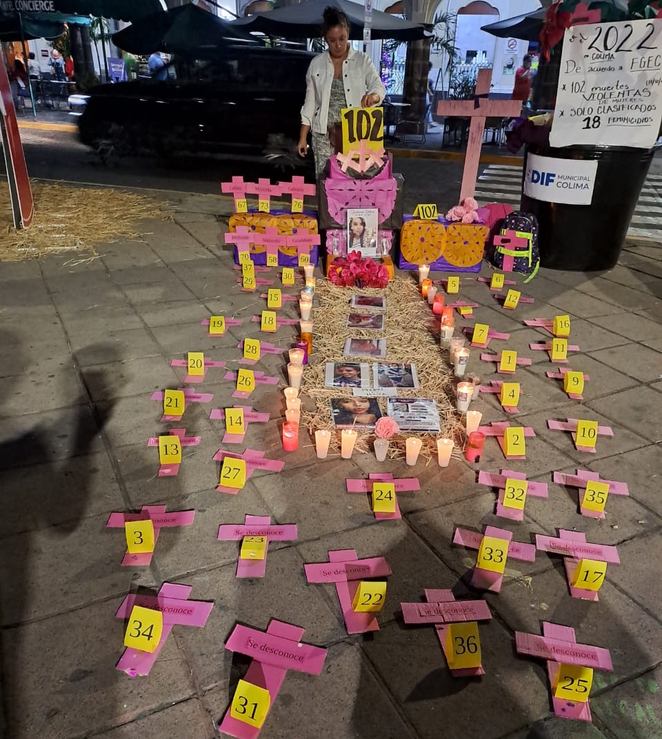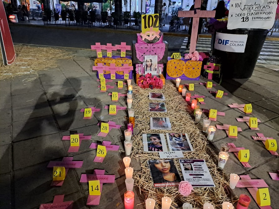 Este lunes por la tarde, diversas organizaciones defensoras de los derechos de las mujeres, así como la Red Desaparecidos en Colima, instalaron un altar en honor a las 102 mujeres que han sido asesinadas durante este año en Colima, de acuerdo con las cifras dadas a conocer por el Vocero de Seguridad.