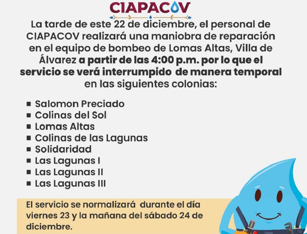 La tarde de este jueves 22 de diciembre, personal de la Comisión Intermunicipal de Agua Potable y Alcantarillado de los municipios de Colima y Villa de Álvarez (CIAPACOV), perteneciente a la dirección de electromecánica, realizará una maniobra de reparación en el equipo de bombeo de Lomas Altas, Villa de Álvarez a partir de las 4:00 p.m. por lo que el servicio se verá interrumpido de manera temporal en las colonias Salomón Preciado, Colinas del Sol, Lomas Altas, Colinas de las Lagunas, Solidaridad, Las Lagunas I, Las Lagunas II y Las Lagunas III.