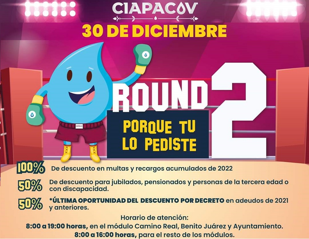 Debido a la gran respuesta del pasado 16 de diciembre donde se realizó con éxito el primer Descontón 2022, a petición de los usuarios de CIAPACOV se llevará a cabo el 'Segundo Round', donde podrán aprovechar la promoción del 50% en adeudos anteriores a 2021 y del 100% en multas y recargos del 2022, en un horario extendido de 8:00 a 19:00 horas en el módulo de Camino Real, donde se podrán realizar pagos con tarjetas de crédito a 3, 6 y 12 meses.