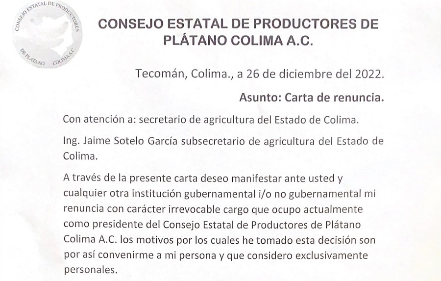 Con fecha 26 de diciembre de 2022, Gustavo Arceo Solís, quien se ostentaba como presidente de la asociación civil Consejo Estatal de Productores de Plátano (Coeplatano), a través de un escrito firmado y sellado dirigido a Jaime Sotelo García, subsecretario de Agricultura del gobierno estatal colimense, presentó su renuncia irrevocable argumentando motivos estrictamente personales.