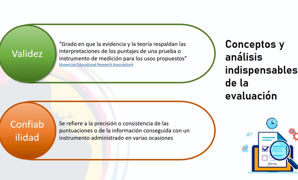 Compartió que en un proceso de evaluación es necesario considerar aspectos como la validez o grado en que la evidencia y la teoría respaldan los puntajes de una prueba o instrumento y la confiabilidad, que se refiere a la precisión y consistencia de la información conseguida con una evaluación administrada en varias ocasiones, en distintos grupos o generaciones, “para determinar si se evalúa lo que realmente se pretende evaluar”.