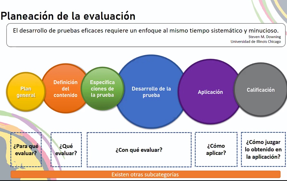 En un orden cronológico, mencionó que este proceso incluye desde el plan general de la evaluación hasta la definición del contenido, las especificaciones y desarrollo de la prueba, la aplicación y calificación. En el plan de la evaluación, la pregunta es para qué evaluar; en la definición del contenido se considera lo que se evaluará; la aplicación se refiere a la forma y, por último, la calificación es la parte más objetiva del proceso, para juzgar lo obtenido en la aplicación.