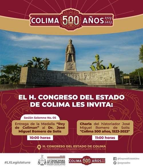En sesión solemne a realizarse este viernes 20 de enero, a las 10:00 horas en el recinto oficial del H. Congreso del Estado, las y los diputados de la Sexagésima Legislatura presidirán la entrega de la medalla “Rey de Coliman” al Dr. José Miguel Romero de Solís, en reconocimiento a su obra y trayectoria en favor de la historia del estado, y posteriormente, a las 11:00 de la mañana, el condecorado historiador impartirá la charla denominada “Colima 500 años, 1523-2023”.