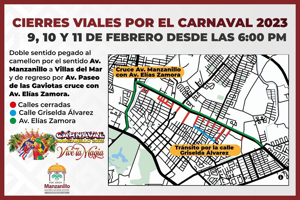Manzanillo, Col. Derivado al desarrollo del Carnaval Manzanillo 2023 “Vive la magia” y el paso de los carros alegóricos y comparsas, el Ayuntamiento pide la comprensión de la población por el cierre parcial de la avenida Elías Zamora Verduzco, del 9 al 11 de febrero, pues sobre carriles de esta vialidad se desarrollarán los tradicionales desfiles.