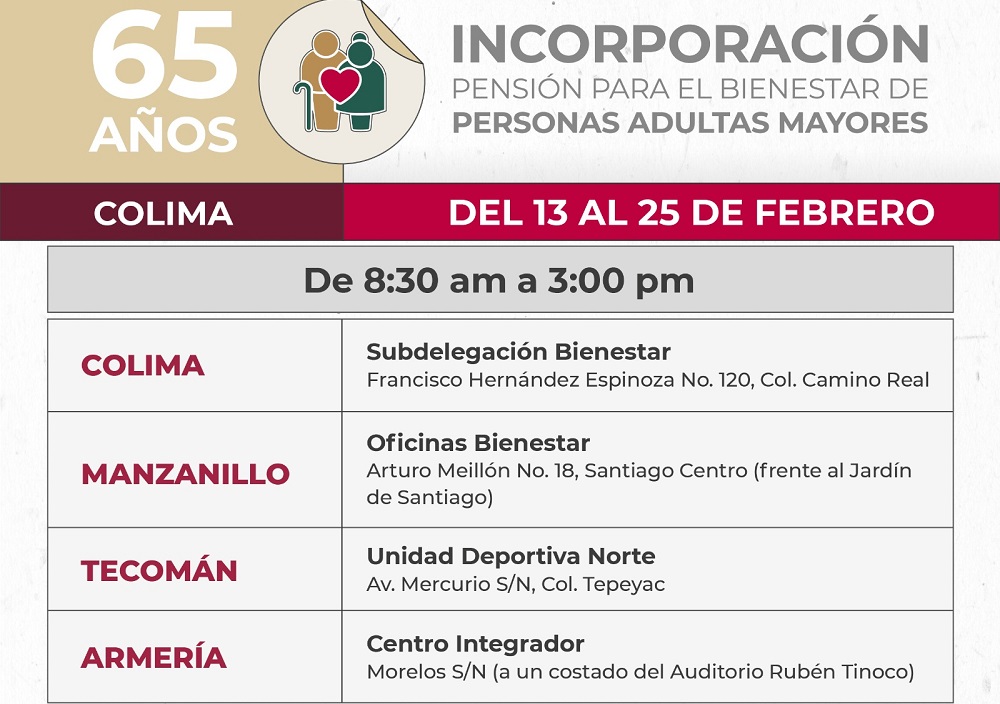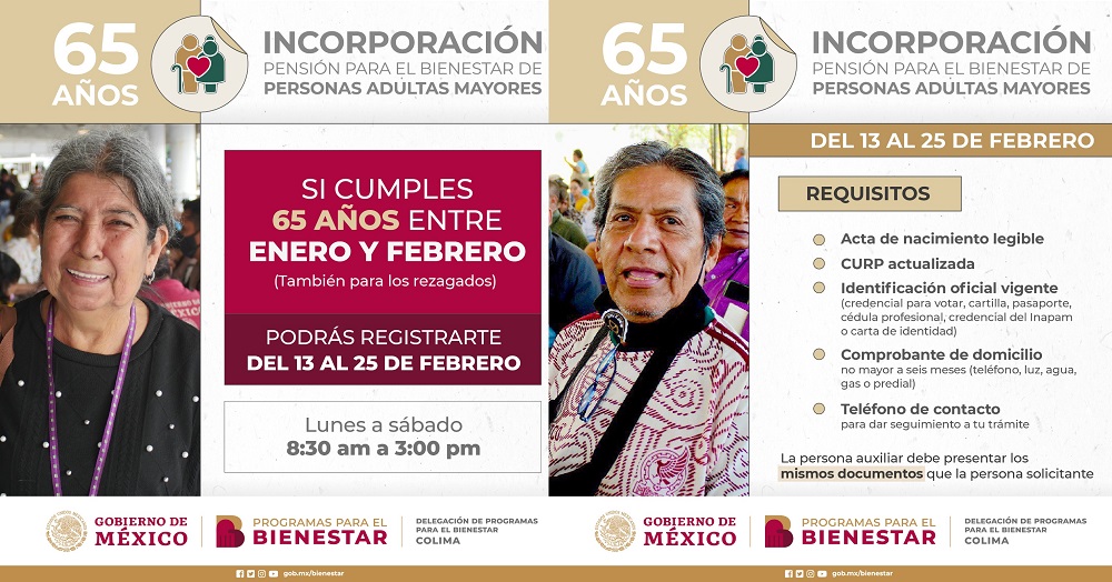 El Gobierno de México, a través de la Secretaría de Bienestar, informa que del 13 al 25 de febrero se realiza el registro para la incorporación a la Pensión para el Bienestar de las Personas Adultas Mayores para quienes cumplen 65 años entre enero y febrero de 2023.