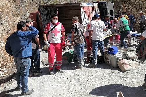 Villa de Álvarez, Col. Al menos dos hombres resultaron lesionados, uno de ellos de gravedad, luego que el camión en el que circulaban por la carretera Villa de Álvarez-Minatitlán, volcara este lunes por la tarde.