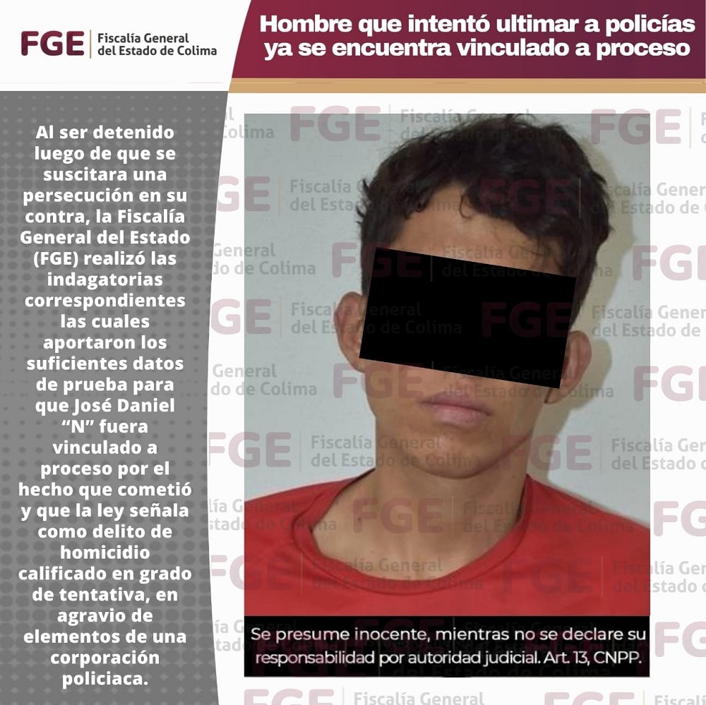 Al ser detenido luego de que se suscitara una persecución en su contra, la Fiscalía General del Estado (FGE) realizó las indagatorias correspondientes las cuales aportaron los suficientes datos de prueba para que José Daniel “N” fuera vinculado a proceso por el hecho que cometió y que la ley señala como delito de homicidio calificado en grado de tentativa, en agravio de elementos de una corporación policiaca.