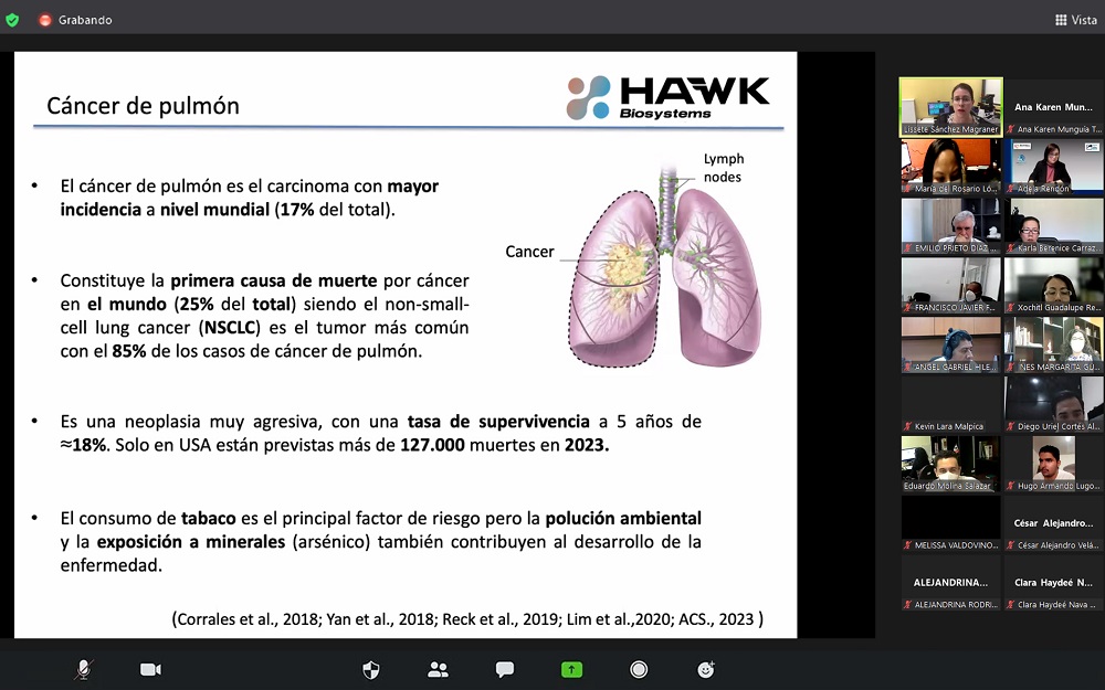 Lissete Sánchez resaltó que el cáncer de pulmón es el carcinoma con mayor incidencia a nivel mundial, con un 17 por ciento del total, y que constituye la primera causa de muerte por cáncer en el mundo, con un 25 por ciento, siendo el Non-Small-Cell-Lung-Cancer (cáncer de pulmón de células no pequeñas, NSCLC por sus siglas en inglés) el tumor más común, con el 85 por ciento: “Es una neoplasia [cualquier crecimiento descontrolado de células o tejidos anormales en el organismo] muy agresiva, con una tasa de supervivencia a cinco años del 18 por ciento; sólo en los Estados Unidos están previstas más de 127 mil muertes en 2023”, mencionó.