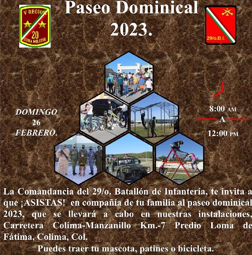 En ese sentido, la 20/a Zona Militar, a través del 29/o Batallón de Infantería con sede el Colima, realizará un Paseo Dominical haciendo una invitación a la ciudadanía para que de las 0800 a las 1200 horas del 26 de febrero puedan acudir al campo militar en donde podrán disfrutar de lo siguiente: