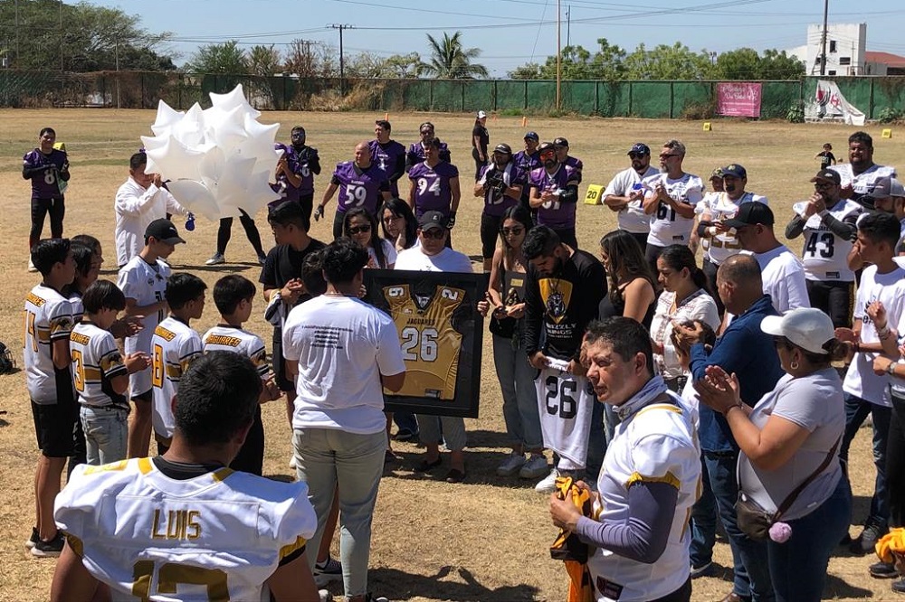 Previo al segundo juego de temporada de los Jaguarukos, quienes obtuvieron el triunfo sobre Ravens de Guadalajara, los niños de la categoría U13, entregaron a la mamá y hermanos de Jorge Alberto, el más reciente trofeo obtenido por el Club Deportivo Jaguares Colima en Flag Football.