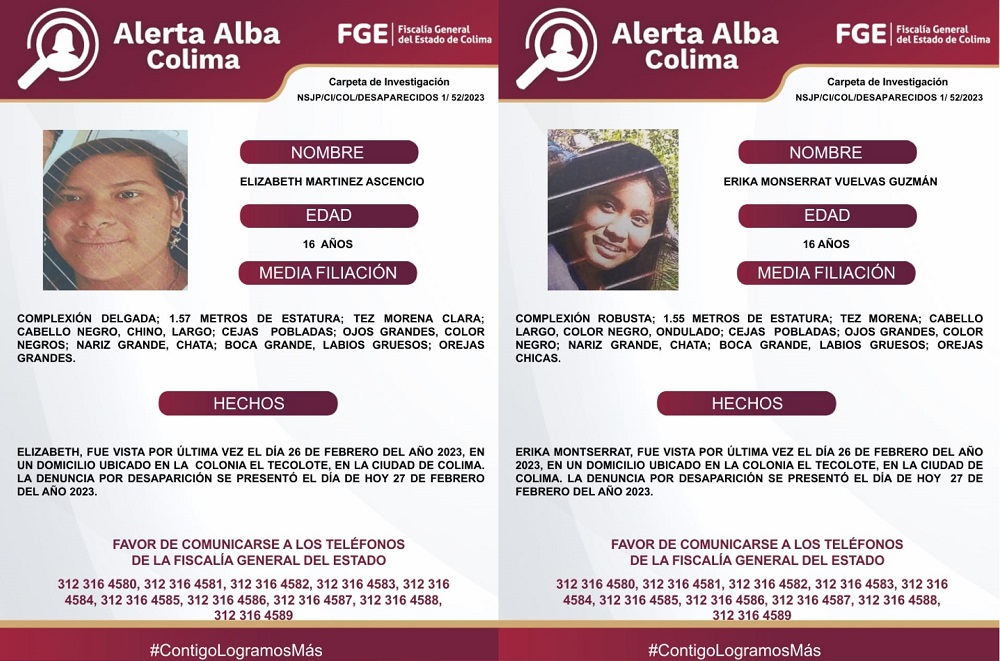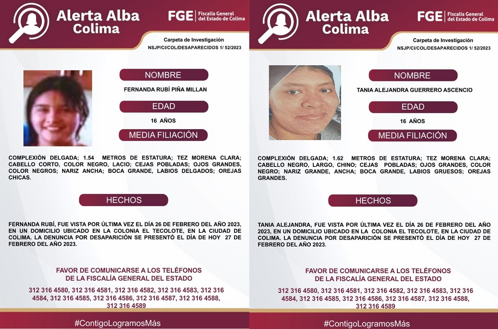 El Protocolo Estatal Alerta Alba, solicita el apoyo y colaboración para lograr la localización de las menores de edad y pide que en caso de tener información que lleve a su localización favor de comunicarse a los teléfonos de la Fiscalía General del Estado: 312 316 45 83
