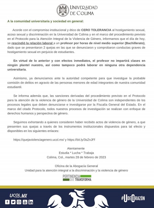 Acorde con el compromiso institucional y ético de CERO TOLERANCIA al hostigamiento sexual, acoso sexual y discriminación en la Universidad de Colima y en el marco del procedimiento previsto en el Protocolo para la Atención Integral de la Violencia de Género, informamos que el día de hoy, se rescindió la relación laboral a un profesor por horas de nivel medio superior (Bachillerato), dado que se presentaron 2 quejas en las que se denunciaron y comprobaron conductas graves de hostigamiento sexual en perjuicio de estudiantes.