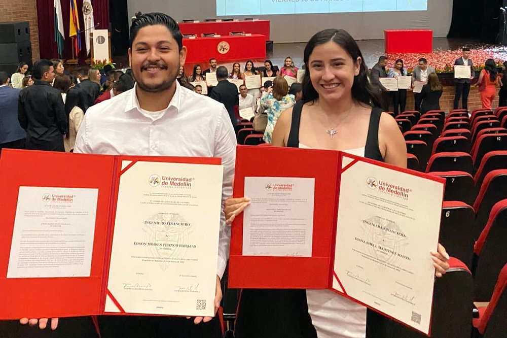 Diana Shell Martínez Manzo y Edson Moisés Franco Barajas, de la Facultad de Economía de la Universidad de Colima, culminaron su proceso de doble titulación al recibir sus títulos de la carrera en Ingeniería Financiera por la Universidad de Medellín, en Colombia.