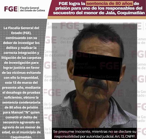 La Fiscalía General del Estado (FGE), continuando con su deber de investigar los delitos y realizar la correcta integración y litigación de las carpetas de investigación para lograr justicia en favor de las víctimas evitando con ello la impunidad, este 13 de marzo del presente año, mediante el desahogo de pruebas suficientes, obtuvo la sentencia condenatoria de 80 años de prisión para Manuel “N” quien cometió el delito de secuestro agravado en agravio de un menor de edad, en el municipio de Coquimatlán.