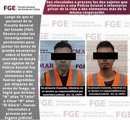 Luego de que el personal de la Fiscalía General del Estado (FGE) llevara a cabo las investigaciones pertinentes para juntar los datos de prueba necesarios sobre el hecho ocurrido en donde una agente de la Policía Estatal fue ultimada y dos elementos más fueron agredidos por disparos de arma de fuego, se logró que Aristeo “N” alias “E Tello” y César “N” alias “El Güero”, fueran vinculados a proceso por el órgano judicial.