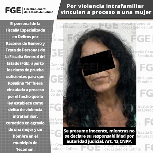 El personal de la Fiscalía Especializada en Delitos por Razones de Género y Trata de Personas de la Fiscalía General del Estado (FGE), aportó los datos de prueba suficientes para que Rosalina “N” fuera vinculada a proceso por el hecho que la ley establece como delito de violencia intrafamiliar, cometido en agravio de una mujer y un hombre en el municipio de Tecomán.