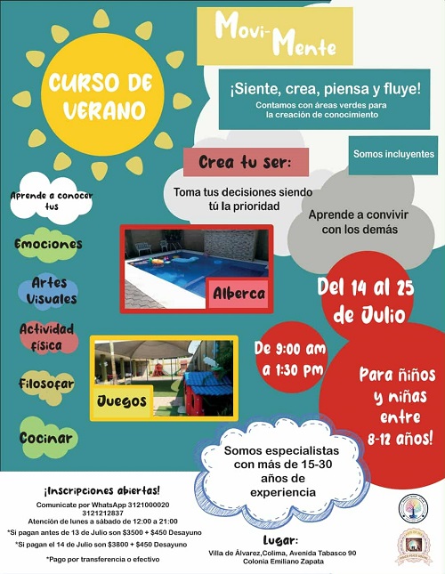 Es por eso por lo que invitó a los padres y madres de familia interesados en que sus hijos participen en este curso de verano, soliciten más información en los teléfonos 312 100 0020 y 312 121 2837, y también que visiten la página de Facebook Arte de Ser, Psico, Físico y Social. Las inscripciones ya están abiertas.