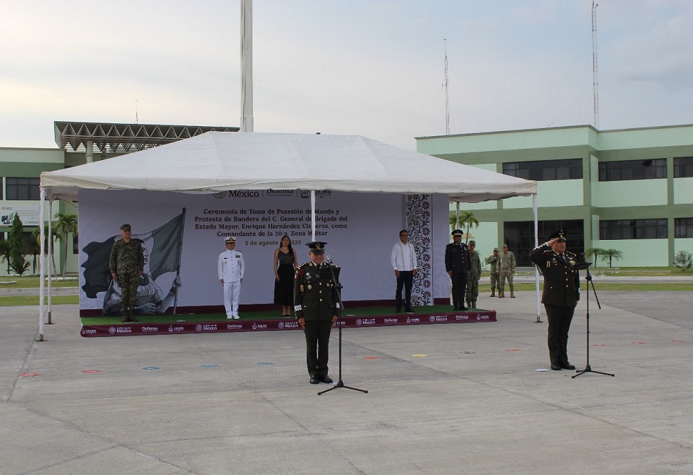 Este martes, el General de Brigada de Estado Mayor Porfirio Fuentes Vélez, Comandante Interino de la V Región Militar, tomó protesta al cargo y dio posesión de mando al General de Brigada de Estado Mayor Enrique Hernández Cisneros, quien con fecha 1/o. de agosto del presente año fue designado como Comandante de la Vigésima Zona Militar (Colima, Col.), durante una ceremonia llevada a cabo en las instalaciones del 29/o. Batallón de Infantería.