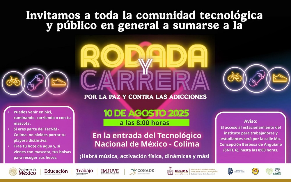 El Tecnológico Nacional de México-Colima (TecNM-Colima) invitó a la población en general a participar en la "Rodada y Carrera por la Paz y Contra las Adicciones" que se llevará a cabo este domingo 10 de agosto a partir de las 8 de la mañana.