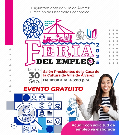 Más de 24 empresas de diversos giros ofrecerán 297 oportunidades laborales en la Feria del Empleo, que el martes 30 de septiembre se realizará en el Salón Presidentes de la Casa de la Cultura de Villa de Álvarez.
