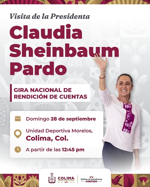 El próximo domingo 28 de septiembre, la presidenta de México, Claudia Sheinbaum Pardo, visitará por quinta ocasión el estado de Colima en lo lleva de su mandato al frente del Gobierno de México; en esta ocasión, su visita forma parte de la gira nacional de rendición de cuentas que emprendió la titular del Poder Ejecutivo federal por cada una de las 32 entidades del país.