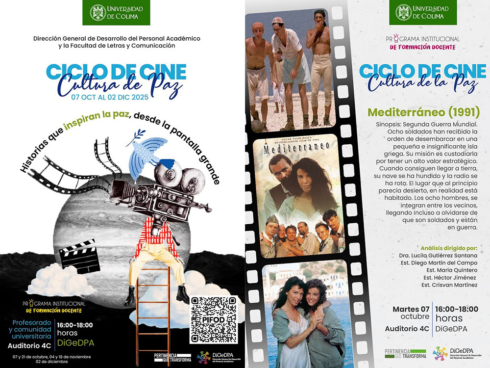 Como parte del plan de cultura de paz 2025 de la Universidad de Colima, la Dirección General de Desarrollo del Personal Académico (DiGeDPA), en coordinación con la Facultad de Letras y Comunicación, llevará a cabo el Ciclo de Cine Cultura de Paz, del 7 de octubre al 2 de diciembre, de cuatro a seis de la tarde, en el auditorio C del edificio de Formación docente, ubicado en el campus central, a un costado del Bachillerato 1.