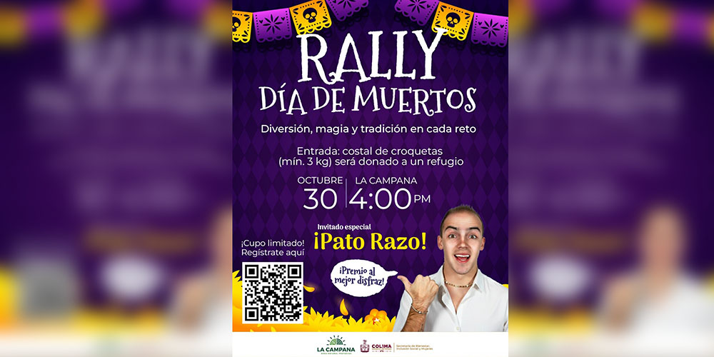El Gobierno del Estado de Colima, a través de la Secretaría de Bienestar, Inclusión Social y Mujeres (Sebiinsom), invita a participar en el rally con causa por el Día de Muertos, en el cual se espera la participación de familias colimenses para que pasen un momento de convivencia y diversión, reviviendo y reconociendo nuestras tradiciones.