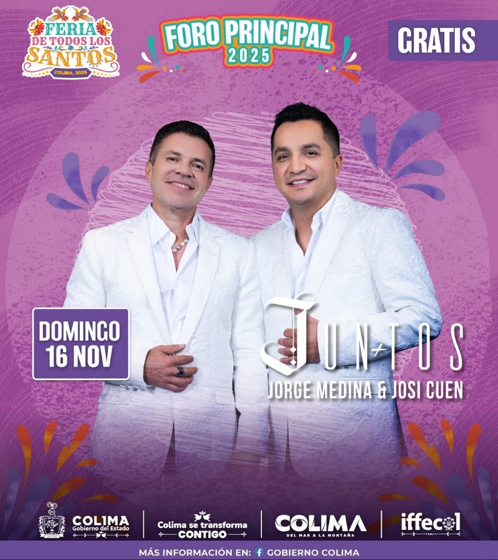 La Feria de Todos los Santos 2025 tendrá este domingo 16 de noviembre uno de sus espectáculos más esperados: el concierto gratuito de Juntos: Jorge Medina y Josi Cuen, quienes se presentarán en el Foro Principal en punto de las 9:00 de la noche en lo que será el quinto concierto masivo que ofrece el Gobierno del Estado de Colima sin costo para el público, informa Rodolfo Aguilar Dávalos, director general del Instituto de Fomento de Ferias y Exposiciones (Iffecol).