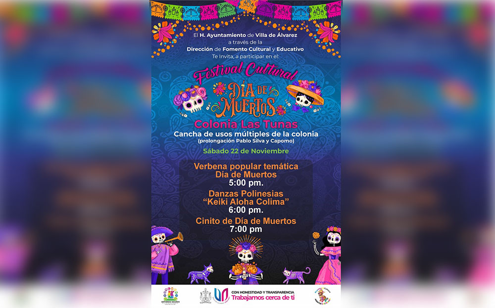El H. Ayuntamiento de Villa de Álvarez, a través de la Dirección de Fomento Cultural y Educativo, invita a la población a disfrutar del Festival Cultural de Día de Muertos que se llevará a cabo este sábado 22 de noviembre en la cancha de usos múltiples de la colonia Las Tunas, ubicada en prolongación Pablo Silva y Capomo.