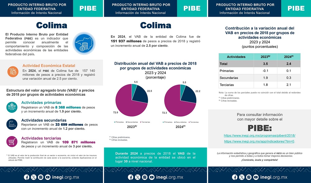 El Producto Interno Bruto por Entidad Federativa (PIBE) de Colima alcanzó en 2024 un valor de 157 mil 140 millones de pesos a precios de 2018, lo que representó un crecimiento anual de 2.5 por ciento, de acuerdo con información del Instituto Nacional de Estadística y Geografía (INEGI).