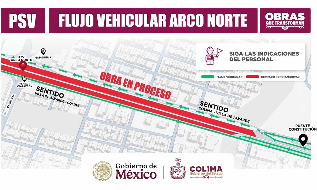 En el sentido Colima hacia Villa de Álvarez, los carriles centrales permanecerán cerrados al descender del PSV Constitución, por lo que la circulación se realizará a través de la vía lateral. En tanto, en el sentido Villa de Álvarez hacia Colima, los vehículos deberán incorporarse a los carriles centrales a la altura de la zona comercial donde se ubica Interceramic, conforme a la señalización instalada en el lugar.