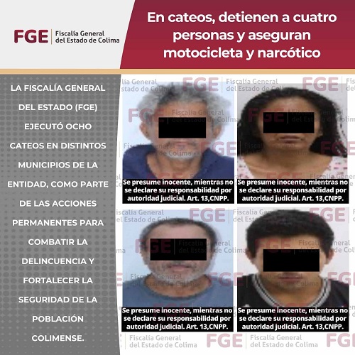 La Fiscalía General del Estado (FGE) ejecutó ocho cateos en distintos municipios de la entidad, como parte de las acciones permanentes para combatir la delincuencia y fortalecer la seguridad de la población colimense.