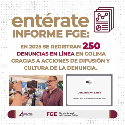 La Fiscalía General del Estado de Colima recuerda a la población que la denuncia en línea es una herramienta disponible las 24 horas del día a través del portal oficial http://www.fgecolima.com, la cual permite iniciar procedimientos legales de manera ágil, contribuyendo así a la prevención del delito y al fortalecimiento del Estado de Derecho.