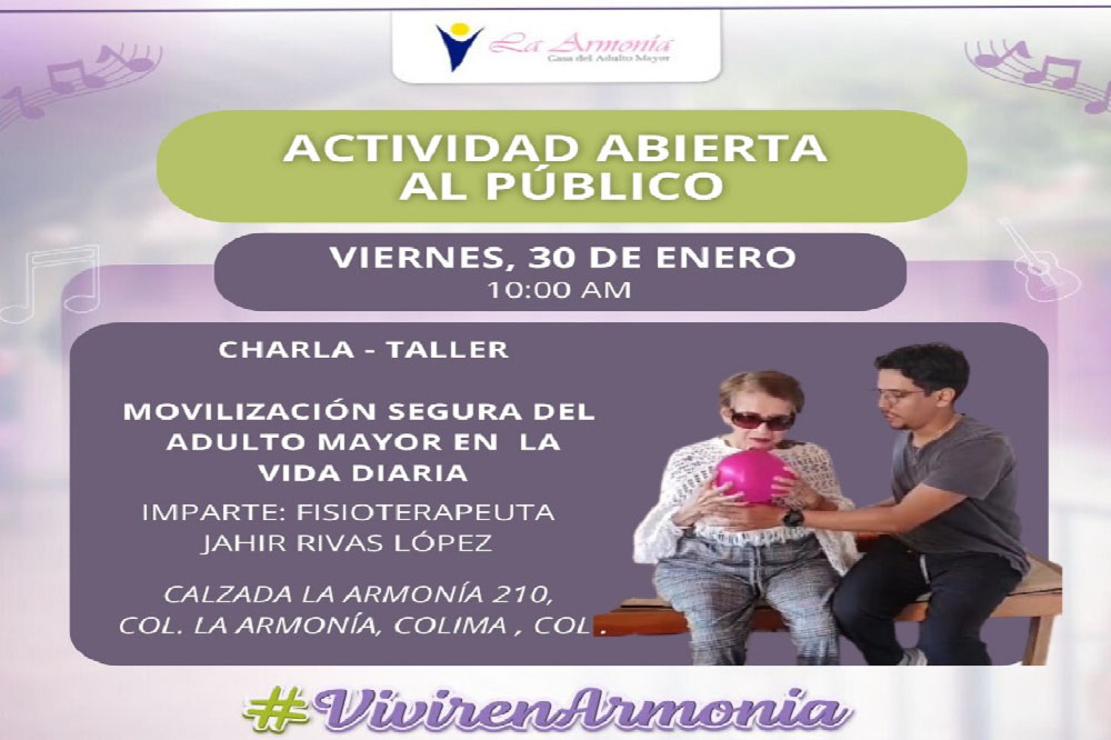 “Como parte de nuestra corresponsabilidad social, continuaremos impulsando este tipo de actividades que ayuden a las familias a mejorar la convivencia y la atención de personas adultas mayores de 65 años o más”. El taller se realizará en las instalaciones de la Casa La Armonía, ubicada sobre Calzada La Armonía 210, Colonia La Armonía en Colima.