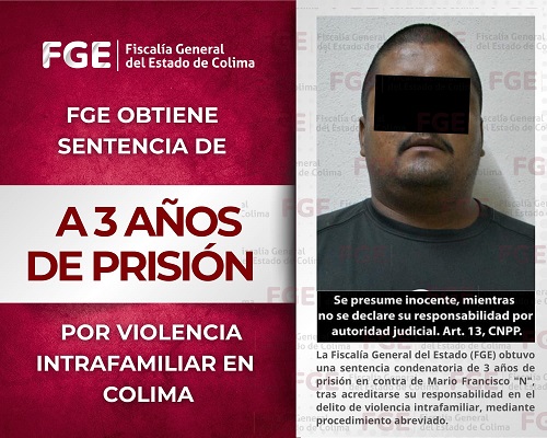 La Fiscalía General del Estado (FGE) obtuvo una sentencia condenatoria de 3 años de prisión en contra de Mario Francisco “N”, tras acreditarse su responsabilidad en el delito de violencia intrafamiliar, mediante procedimiento abreviado.