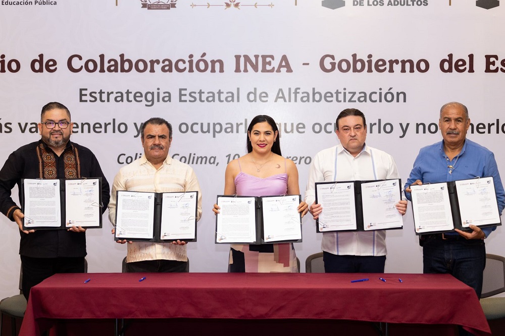 La gobernadora Indira Vizcaíno Silva encabezó este martes la firma del convenio de colaboración entre el Gobierno del Estado de Colima y el Instituto Nacional para la Educación de los Adultos (INEA), que busca fortalecer el compromiso del Estado con la educación de las personas adultas, así como renovar los esfuerzos para atender y abatir el rezago educativo en la entidad.