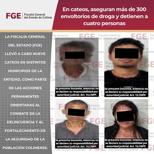 La Fiscalía General del Estado (FGE) llevó a cabo nueve cateos en distintos municipios de la entidad, como parte de las acciones permanentes orientadas al combate de la delincuencia y al fortalecimiento de la seguridad de la población colimense.
