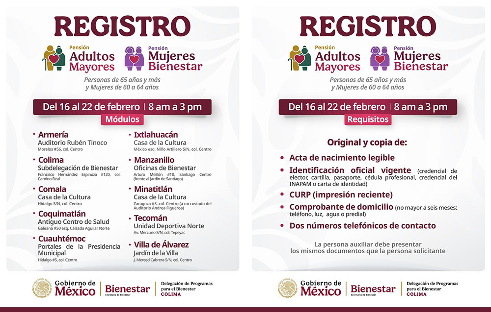 Explicó que más de 2 mil 500 módulos se encuentran instalados en diferentes puntos del país, para realizar el registro. Los módulos permanecen abiertos de lunes a domingo de 10:00 de la mañana a 04:00 de la tarde. Para ubicar el módulo de registro, se puede consultar la página de la Secretaría de Bienestar: www.gob.mx/bienestar.