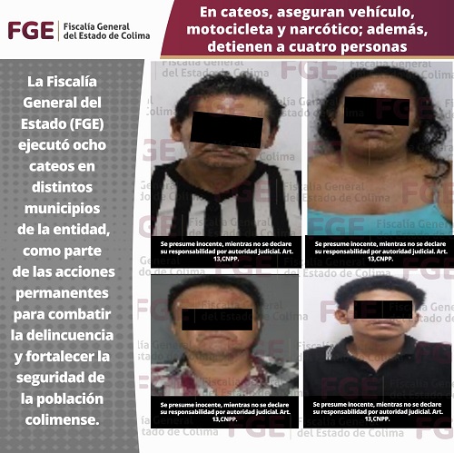 La Fiscalía General del Estado (FGE) ejecutó ocho cateos en distintos municipios de la entidad, como parte de las acciones permanentes para combatir la delincuencia y fortalecer la seguridad de la población colimense.